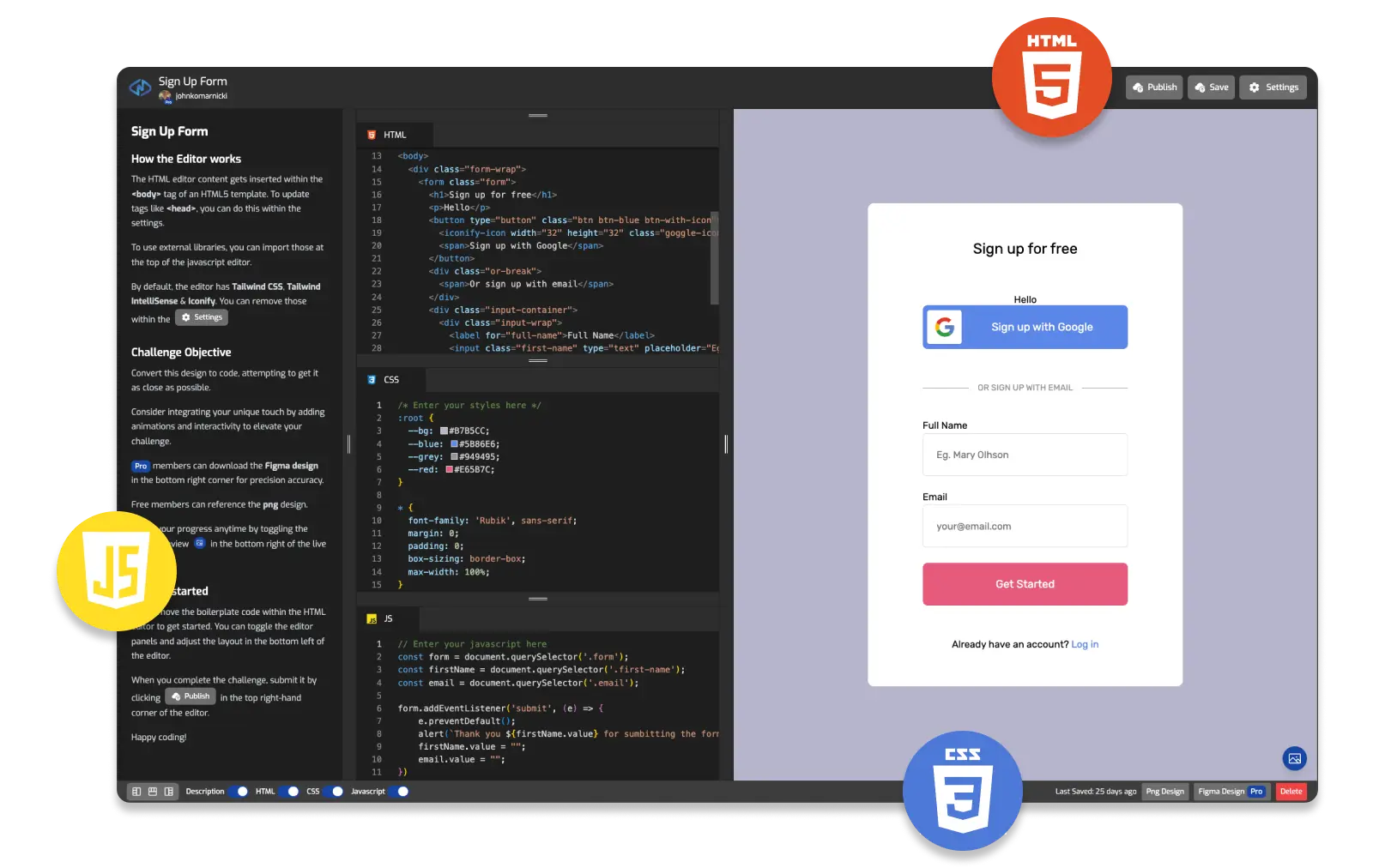 Enhance your HTML, CSS, and JavaScript skills through realistic frontend coding challenges and projects. We handle the design, allowing you to focus on coding and work like a professional developer.