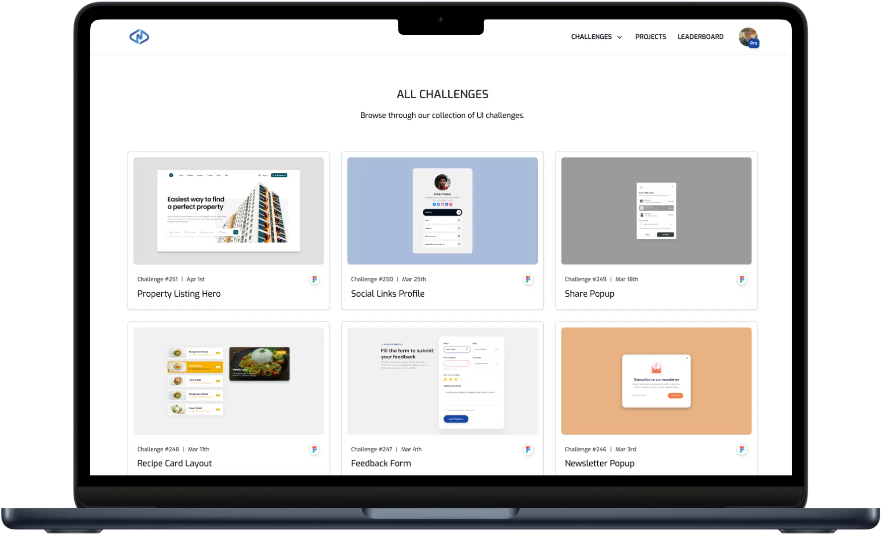 Tackle skill-enhancing design-to-code challenges. These challenges are designed to refine your abilities and showcase your expertise.